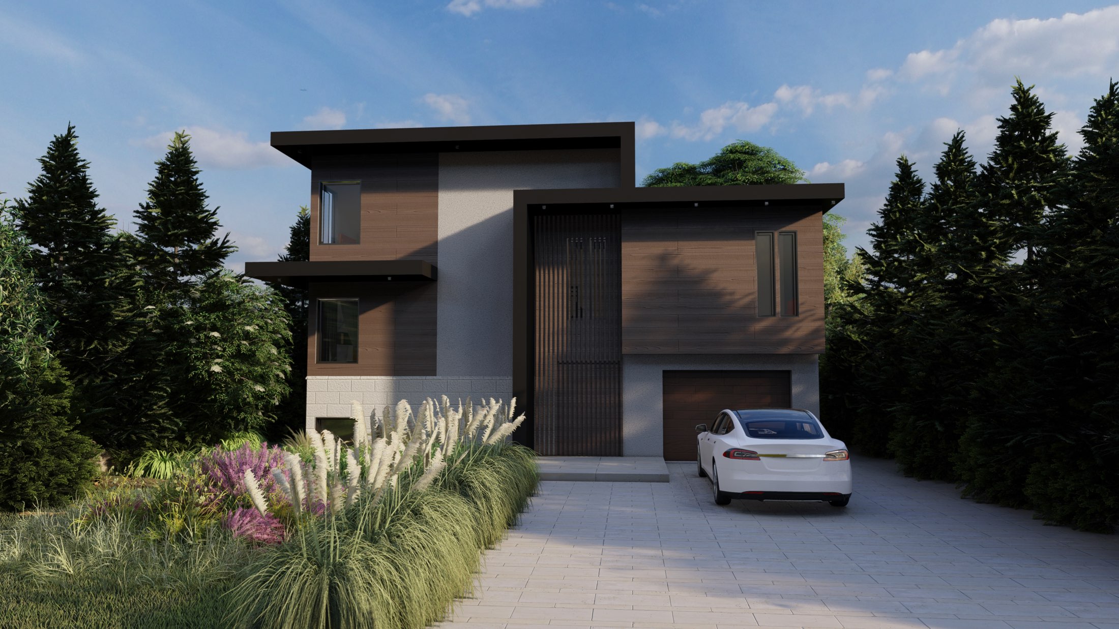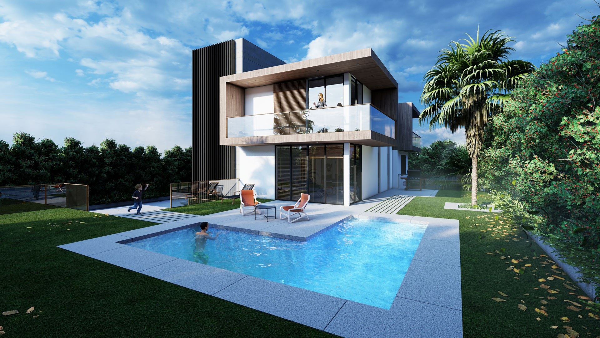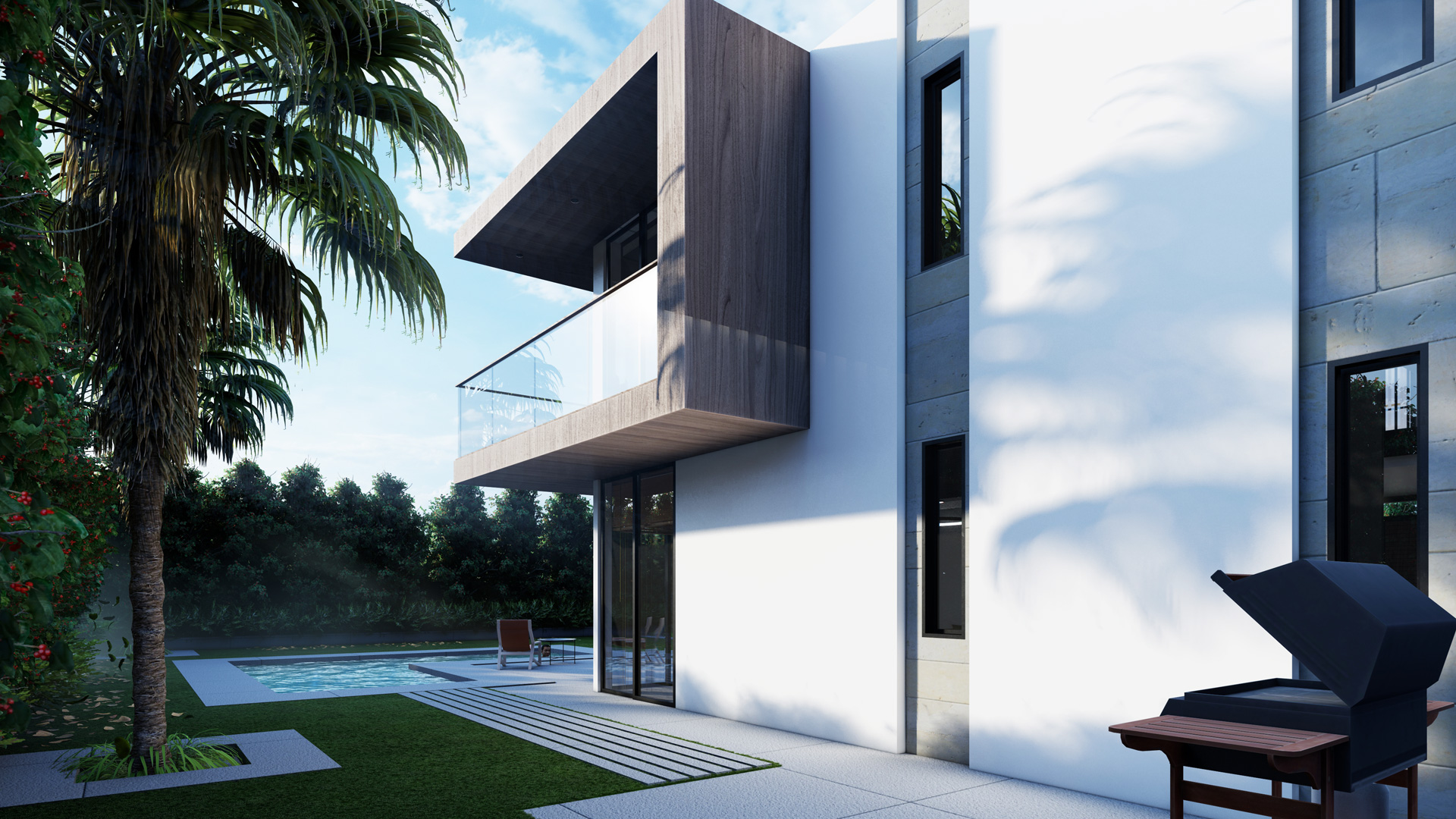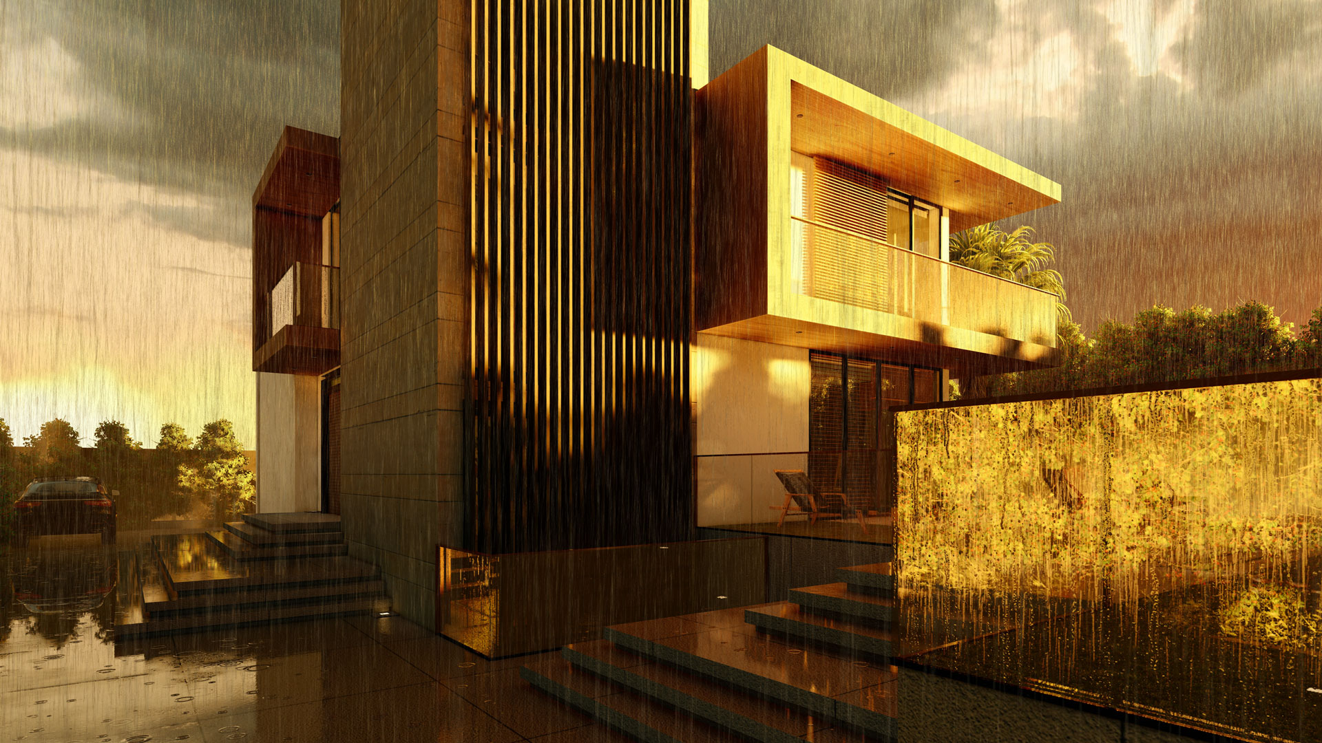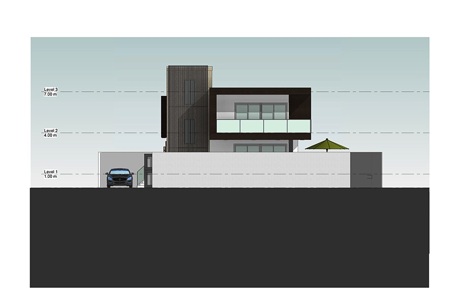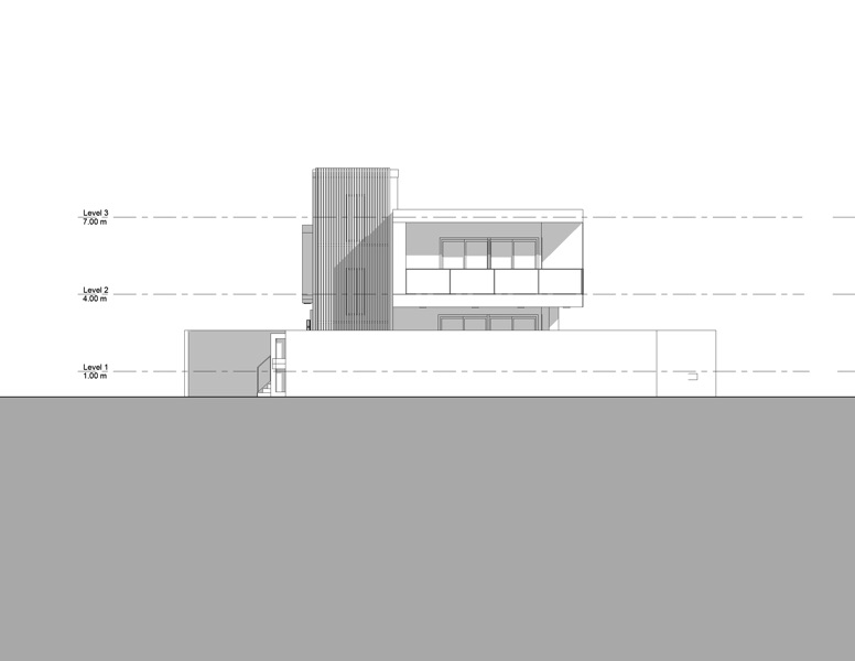 This house embodies a modern and sustainable approach with an emphasis on clean lines and geometric volumes that combine form and function, minimizing the home's cooling load and enhancing its overall energy performance. The building’s layout is thoughtfully designed, featuring large glass windows that facilitate natural light penetration, reducing the need for artificial lighting and contributing to energy efficiency. The cantilevers and the vertical louvered elements serve as a smart bio-climatic feature, offering sun shading to control solar heat gain while also allowing for passive cooling through natural ventilation The open outdoor spaces and terraces encourage social interaction and a connection with nature, promoting a holistic living experience that's in harmony with sustainable principles. The landscaping design presents a sophisticated blend of formality and naturalism, The choice of native plant species that require less water and maintenance.
